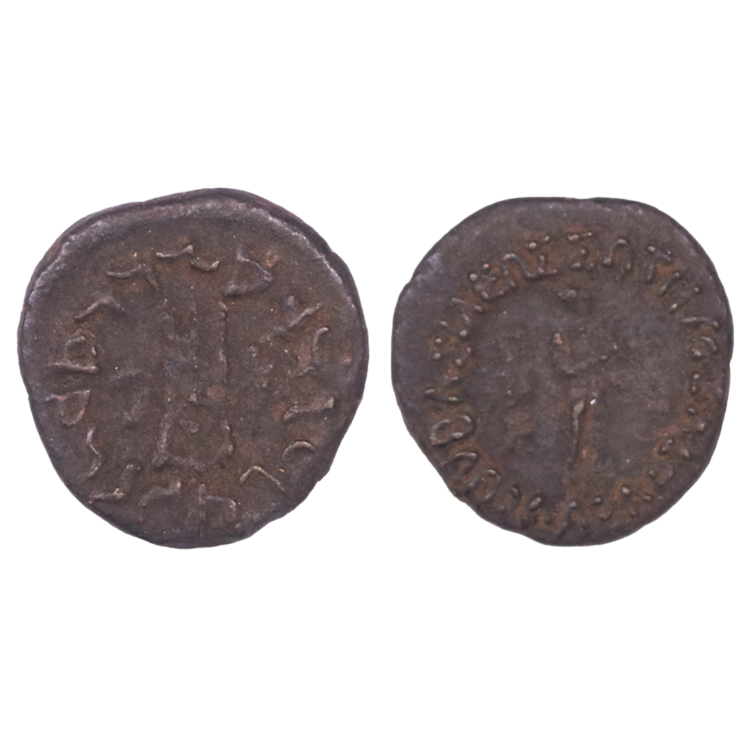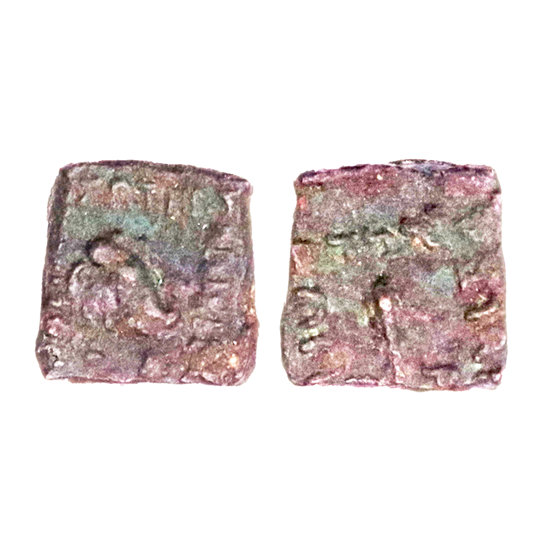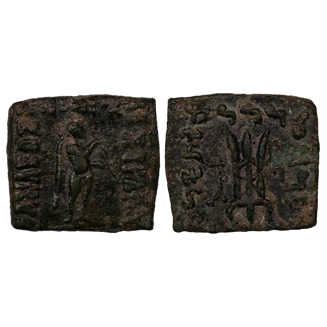 Indo-Greeks, Antialcidas (c. 115-95 BC), Copper Square Unit, 9.24gms, OBV: Diademed bust of the king to right holding thunderbolt on shoulder with Greek legend around , REV: Cap of Dioscuri with palms in center and Kharoshthi legend. (Bopearachchi & Rahman # 460). Fine.