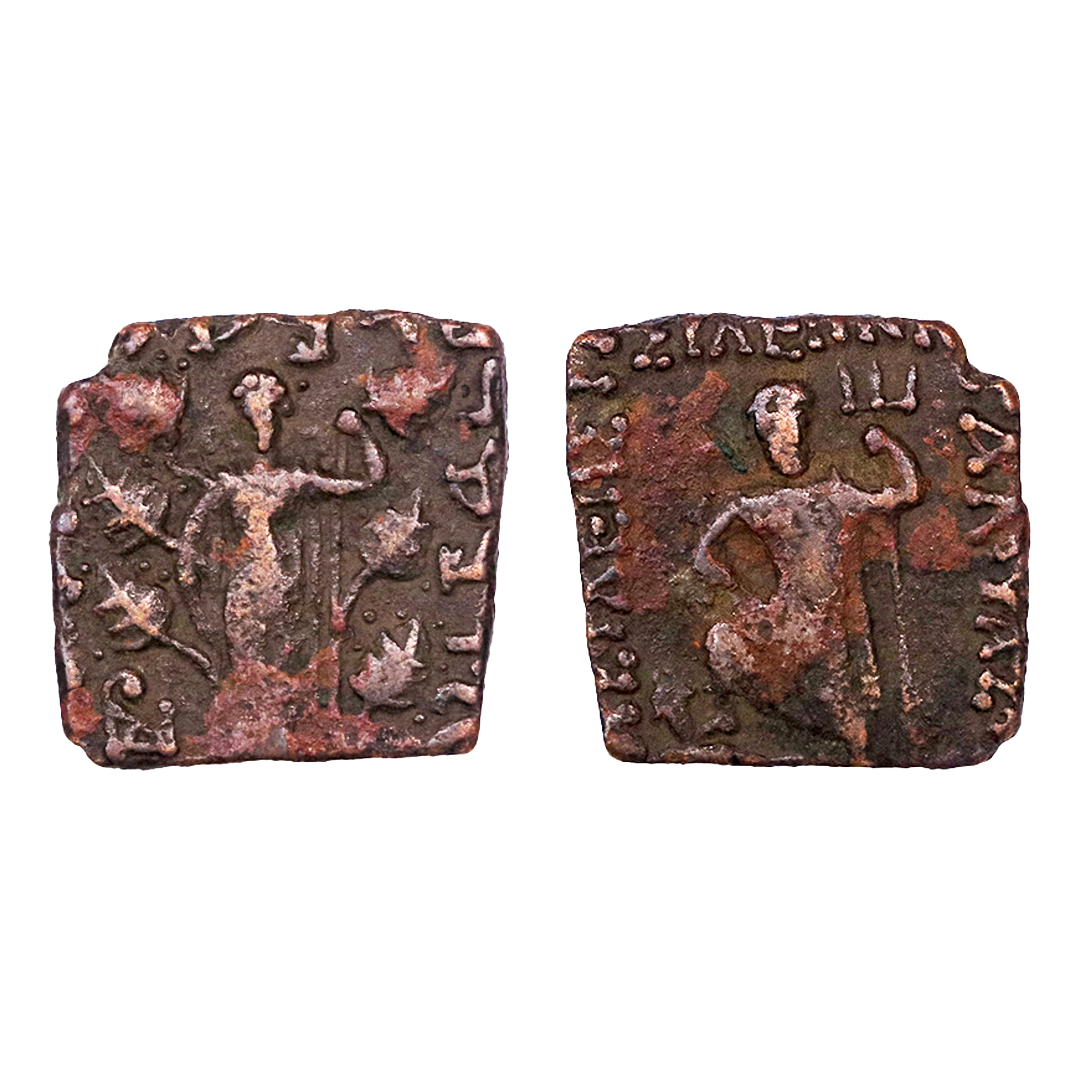 Indo-Greeks, Pushkalavati Mint, Menander I (155 - 130 BC), Copper Square Unit, Obv: elephant head right, trunk raised, bellsuspended from neck, with legend around BAIE THPO MENANPO, Rev: kharoshthi legend, 'maharajasa tratarasa menandrasa' (Great King Savior Menander), club of herakles, vertical, handle down, monogram left, A right, about very fine, Rare.