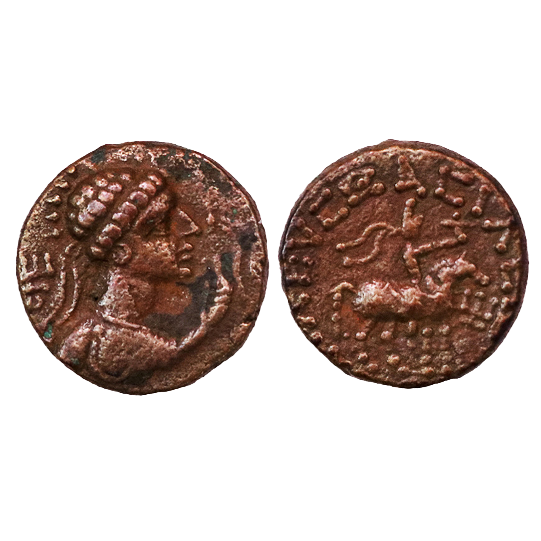 Ancient India, Kushana Dynasty, Soter Megas alias WimaTakto (c. 90-113 AD), Copper Drachm, 8.25gms, OBV: Bust of the Kushan ruler to right wielding a spear in front of his face and behind monogram, REV: The king mounted on a horse to right with Kharoshti legend around and monogram front of horse. (Mitch # ACW 2939). Fine+.