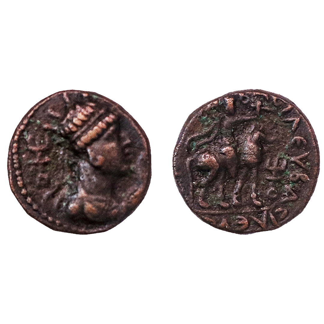 Ancient India, Kushana Dynasty, Soter Megas alias WimaTakto (c. 90-113 AD), Copper Drachm, 8.41gms, OBV: Bust of the Kushan ruler to right wielding a spear in front of his face and behind monogram, REV: The king mounted on a horse to right with Kharoshti legend around and monogram front of horse. (Mitch # ACW 2939). Fine+.