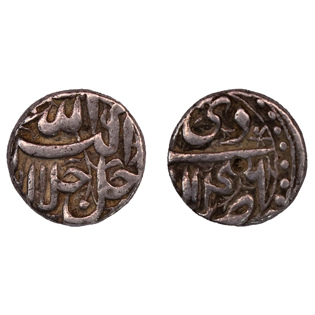 Akbar (AH 963-1014 / 1556-1605 AD), Silver ½ Rupee, 5.52gms, Lahore Mint, Ilahi type, Month Bahman, Year 42, Jalla Jalalhu type. (KM # 66.3).