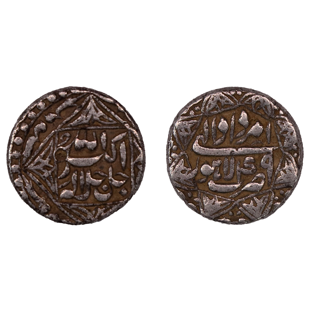 Akbar (AH 963-1014 / 1556-1605 AD), Silver ½ Rupee, 5.52gms, Lahore Mint, Ilahi type, Month Bahman, Year 42, Jalla Jalalhu type. (KM # 66.3).