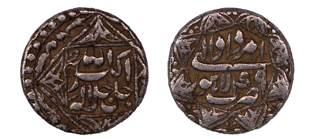 Akbar (AH 963-1014 / 1556-1605 AD), Silver Rupee, 11.35gms, Lahore Mint, Ilahi type, Month Amardad, Year 49, Jalla Jalalahu type, , legend on obv within quatrefoil and legend on rev within eight pointed star. (KM # 94.3). Very Fine, rare.