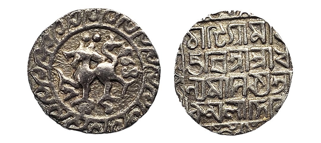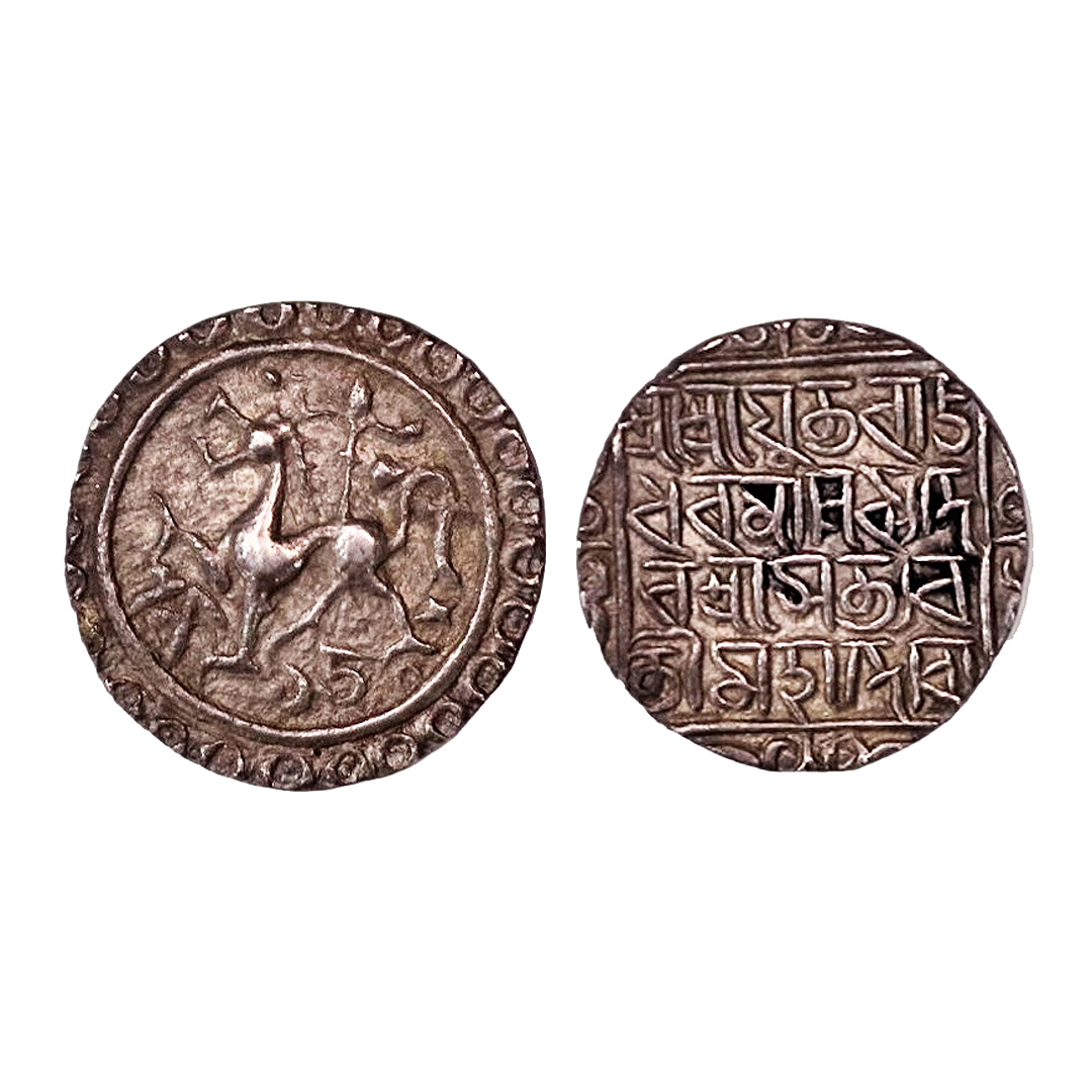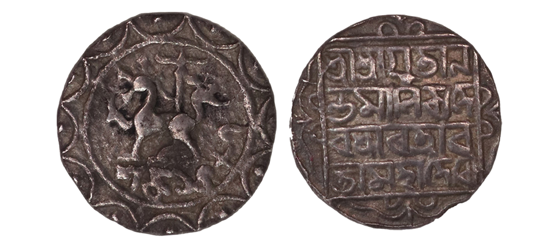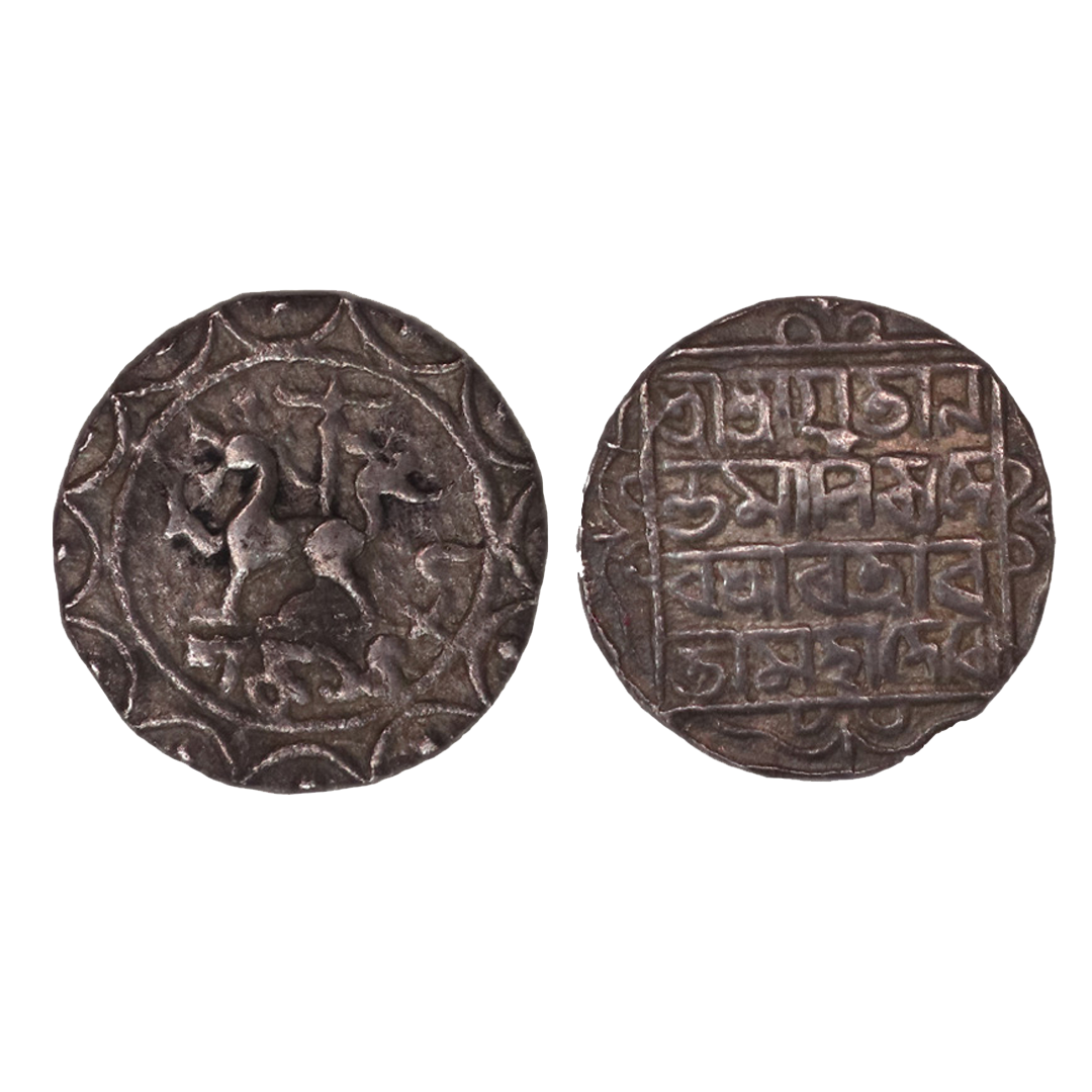 Tripura, Dhanya Manikya, Tanka, 10.17, Sk 1435, victory issue, citing Queen Kamala, lion to right, with two large pellets by lion's mouth, date below, all within a circle and fin-like border, rev. Chattigram Vi/jayi Åšri Åšri Dha/nya Manikya Åšri/ Kamala Devyau within square and ornamental border (RB. 73), very fine, rare