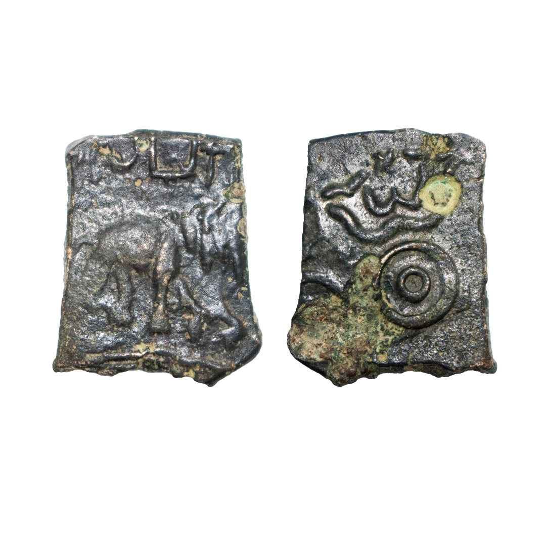 Post-Mauryan, Mitras of Kaushambi region, Brhaspatimitra, Copper Unit, 5.08grms, OBV: Bull (WORN OUT), REV: Tree-in-railing below Brahmi legend ?Bahasati[mitasa?. (Pieper # 1155 VAR.). Very fine