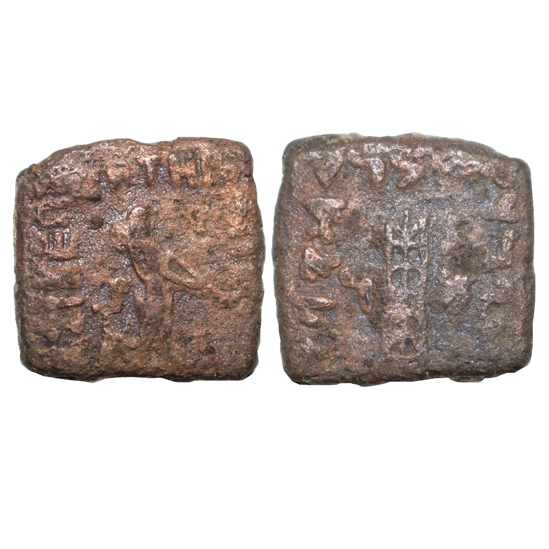 Panchala of Ahichhatra Dynasty, Indramitra, Copper, 5.36grms, OBV: God Indra standing on a pedestal holding a danda like object, REV: Above the three Panchala symbols in a row, below legend in Brahmi Indramitasa in a deep square. (Pieper # 1339). Very fine