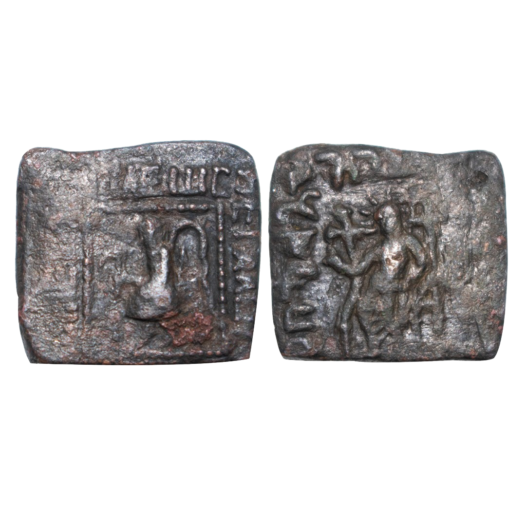 Indo-Greeks, Posthumous issue in the name of Hermaeus, Copper Drachma, 9.04grms, OBV: diademed and draped bust of king facing to right around Greek legend, REV: Zeus enthroned holding sceptre and palm, with Kharoshti legend around. (Bop & Rahman # 643). Very fine