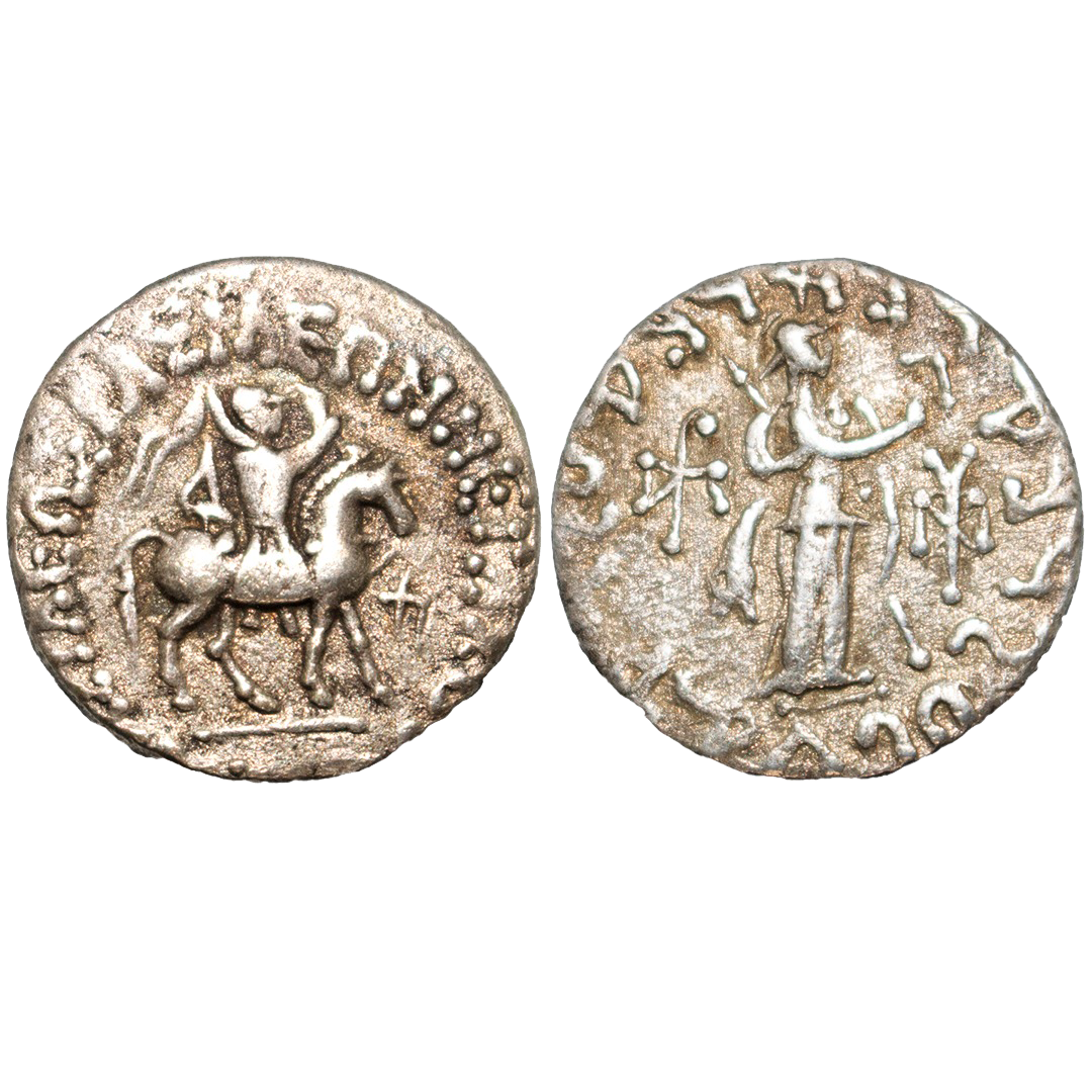 Menander - copper square Octople Weight 20.92grms, Head of bull facing, Greek legend on three sides: BA?I?E?? ??THPO? MENAN?POY, Tripod, monogram at left, Kharoshthi legend on three sides: maharajasa tratarasa menamdrasa, Reference: MIG 233a, Bop 29A. Very fine