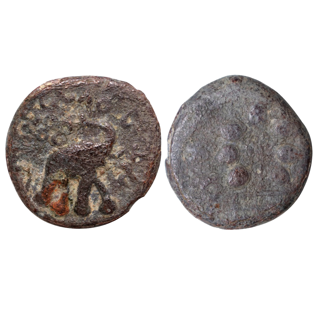 Satavahanas, Siri Satavahana, Lead Unit, 12.48grms, OBV: Elephant walking to right side with trunk upraised above ujjaini symbol and around Brahmi legend ?Siri Satavahanasa?, REV: Tree-in-railing. (Pieper # 2624). Very fine