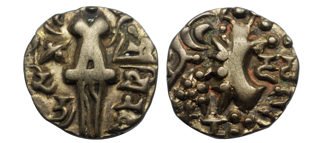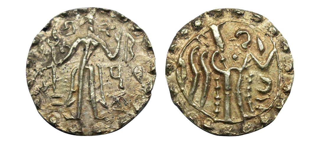 Post Gupta, Dynasties of Gauda, Mahasmanta Sasanka Deva (c. 606-619 AD), Base Gold Stater 8.70grms. OBV: King posed as lord Shiva reclining on his vehicle Nandi bull, Full Moon behind, legend ?Jaya? in Brahmi below, REV: Abhisheka Lakshmi nimbate, seated cross-legged on a lotus, holding lotus in one hand and making a gesture of benevolence with the other, while two elephants standing on lotuses lustrate her, with Brahmi legend ?Shri Shashanka? to right. (Sanjeev Kumar # Class I type). Very fine
