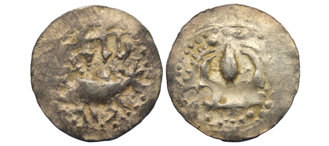 Chandra Dynasty, Harikela series, (c. 750-850 AD), Silver Bracteate Unit, 5.34grms, Obv: Bull to left, Legend above reading ?Harikela?, Linear and dotted circular border around, Rev: An ornate Tripatriate (Shrivatsa?) symbol with Sun and Moon on top, Linear and dotted circular border around. ( Bose and Nasir # Type D). very fine