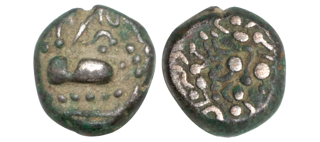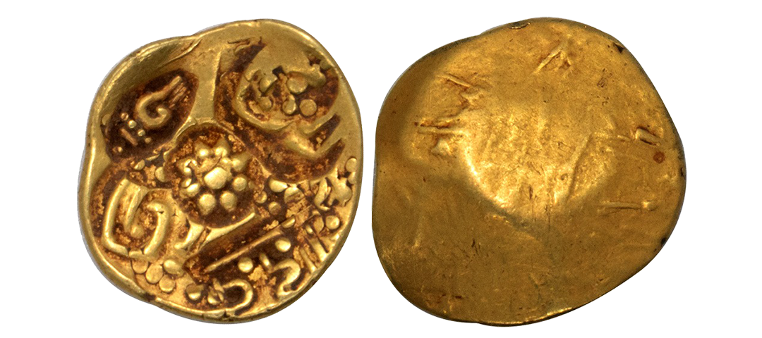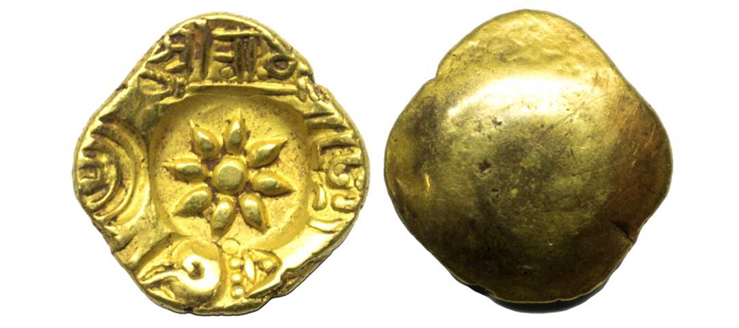 Yadavas of Devagiri, Singhana Deva (c. 1200-1247 AD), Gold Padma Tanka, 3.82grms, Punc Marked type, OBV: Lotus in centre, twice punches of Kannada letter Shri, Shankha or Conch shell and 1 punch of Devnagari legend with a sword below. (Mitch # K&A 287).extremely fine