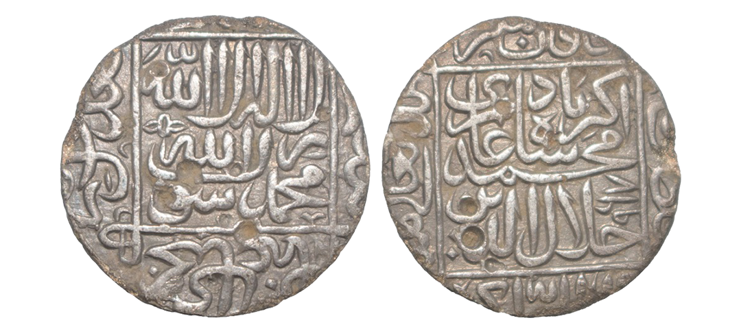 Akbar (AH 963-1014 / 1556-1605 AD), Silver 1/2 Rupee, 5.66grms, Agra Mint, Ilahi type, Month Azar, year 47, with the face value Darb word (1/2 Rupee) below mint name, legend on obv within quatrefoil and legend on rev within eight pointed star. Unlisted in KM. extremely fine