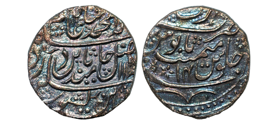 Shah Alam II (AH 1174-1221 / 1759-1806 AD), Silver Rupee, 10.91grms, Hathras Mint, RY 14, mint name on rev top area. (KM # 640). extremely fine