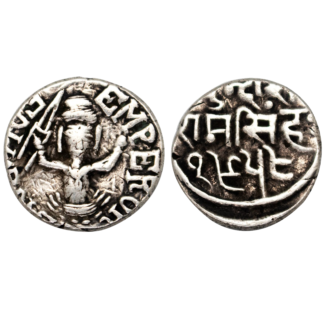 Princely States, Bharatpur, Jaswant Singh (AH 1269-1311; 1853-1893 AD), Silver Rupee, 11.03grms, Brajinderpur Mint, VS 1914, 1858 AD, with the name and portrait of Queen Victoria on obv., Katar and star mint mark on rev., complete die impression on both sides. (KM # 166.2). Extremely fine