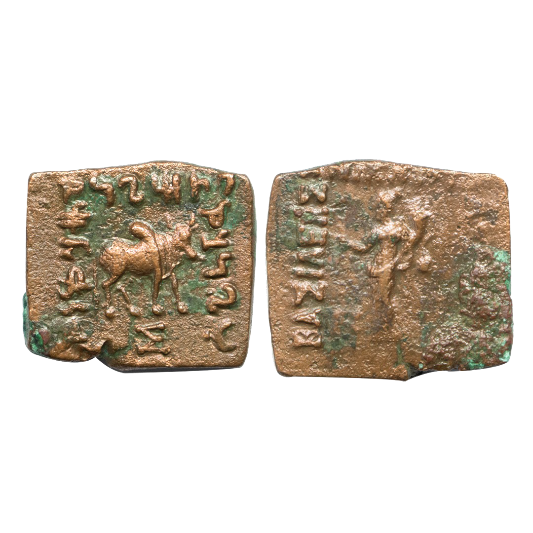 Indo-Greeks, Philoxenos (c. 110-80 BC), Copper Square Unit, 8.56Grms, OBV: City-Goddess standing to left holding cornucopia, right hand on a hip and monogram to left with Greek legend around, REV: A humped bull standing to right with Kharoshthi legend. (Bopearachchi & Rahman # 483). Very Fine+.
