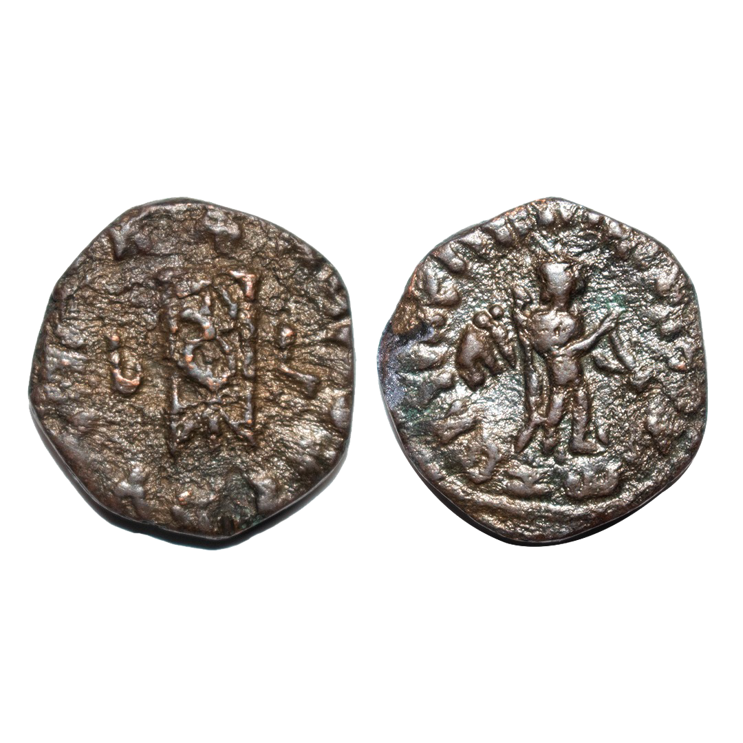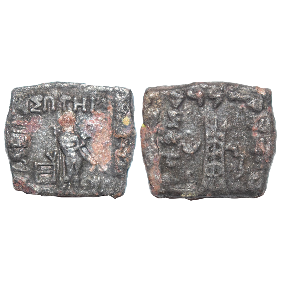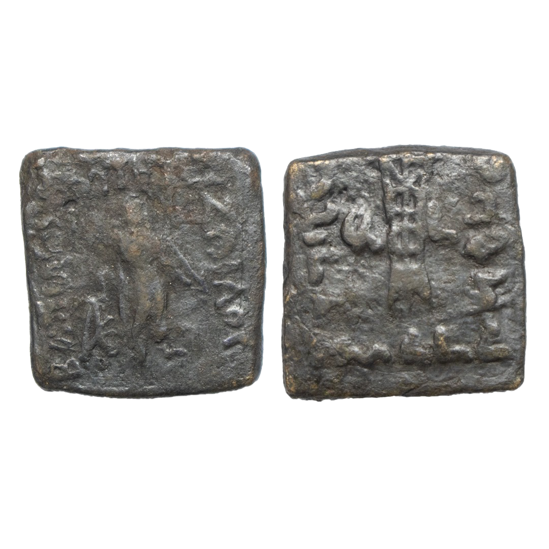 Indo-Greeks, Hippostratos (c. 80-60 BC), Square Copper, 4.41Grms, OBV: Apollo with quiver on back, standing right, holding arrow with Greek legend, REV: Tripod with tamgha on right and Kharoshthi legend. (Bopearachchi # 9A). Very Fine.