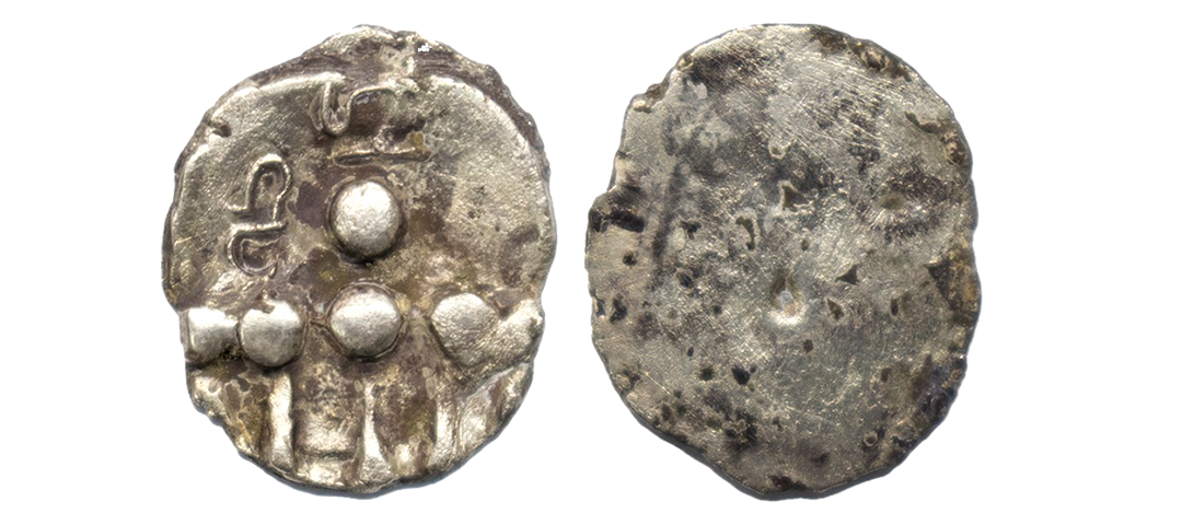 Kashmir Kidarite, in the name of Pratapaditya (500-600 AD), Very low Base Gold Dinar, 7.22Grms, OBV: Crude representation of a Kushan-style king offering sacrifice, Brahmi legend Kira(da) under his arm. REV: Crude representation of goddess seated on throne; Brahmi legend Sri Pratapa in right field. (Mitch # ACW 3638-43).