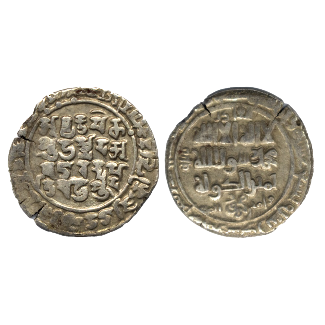 Gurjara-Pratiharas, Vigraha Pala, Sassanian type, Billon Drachma 3.40g,17.3mm. Obv: Stylized king head facing to right with crowned, Nagari legend Sri Vigra front of face, Rev: Fire altar flanked by attendents, J. Deyell # 1. very fine, scarce.