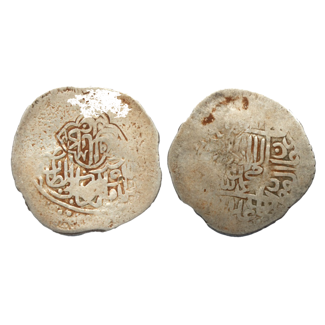 Akbar (AH 963-1014 /1556-1605 AD), Adl-e-Kabul, Silver Shahrukhi, AH 9x5, Counterstamped with 'Adl-e-Kabul' on Shaybanid's Shahrukhis, Obv: Arabic legend the Kalima Shahada within a quarterfoil & four Caliphs name in the margins, Rev: Arabic legend Counterstamped 'Adl-e-Kabul (Justice of Kabul)' & 'khuld mulkahu wa sultanahu' at the bottom, 4.60g, 28.76mm, about very fine, Very Rare.