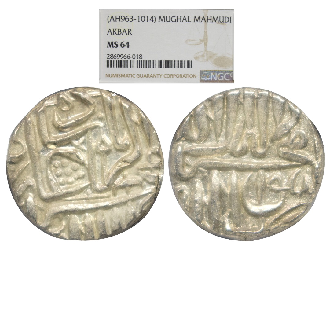 Akbar (AH 963-1014 /1556-1605 AD), Mulhar Mint, Silver 1/2 Rupee (Mahmudi), Baglana issue, Obv: Arabic legend The Kalima Shahada, Rev: Persian legend Jalal-ud-din Muhammad Akbar Badshah Ghazi , (KM # 72.1), graded & slabbed by NGC as Mint State 64, Rare in this grade.