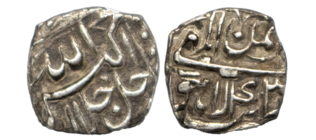 Mughals, Akbar (AH 963-1014 / 1556-1605 AD), Silver Square 1/8 Rupee, 1.34Grms, Lahore Mint, Month Bahman, Year 43, Jal-jalla-lah Allahu Akbar type. (KM # B50). Very Fine. Extremely Rare