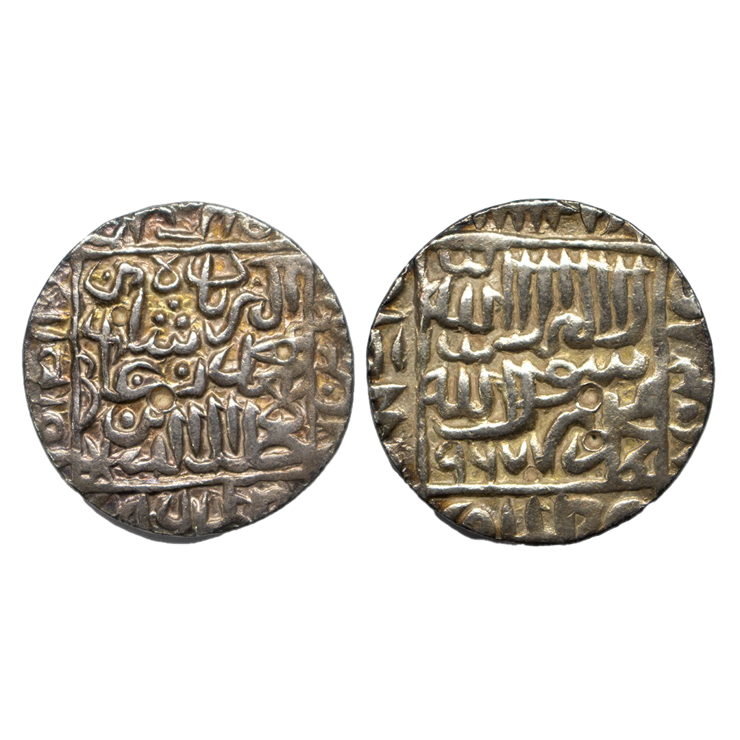 Mughals, Akbar (AH 963-1014 / 1556-1605 AD), Silver Square 1/8 Rupee, 1.34Grms, Lahore Mint, Month Bahman, Year 43, Jal-jalla-lah Allahu Akbar type. (KM # B50). Very Fine. Extremely Rare