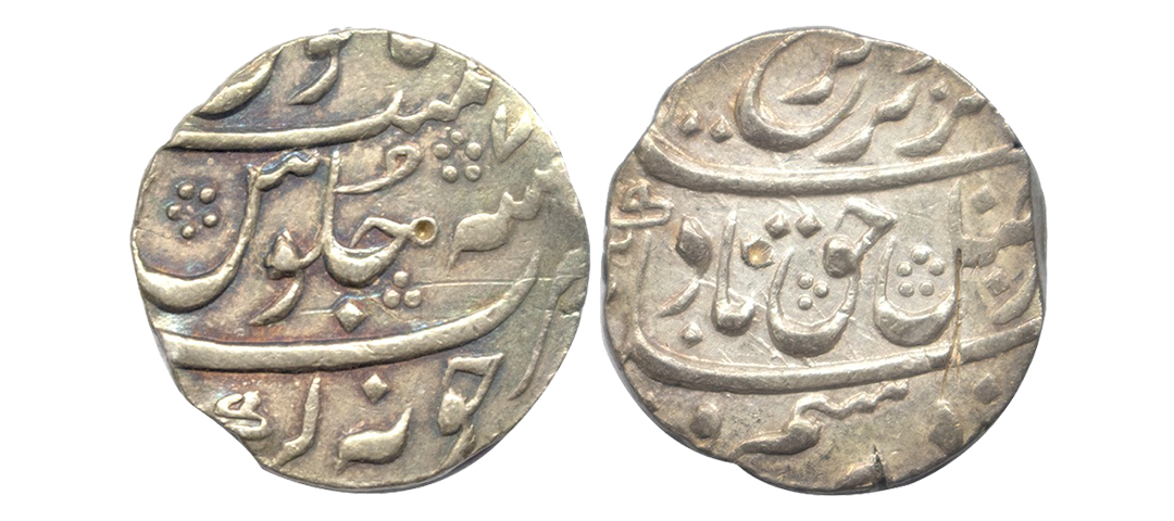 Mughals, Farrukhsiyar (AH 1124-1131 / 1713-1719 AD), Silver Rupee, 11.50Grms, Farkhanda Bunyad Hyderabad Mint, AH 1128, RY 5, mint name on top area and epithet on bottom area, floral design on both sides. (KM # 377.31). Very Fine+, Scarce.