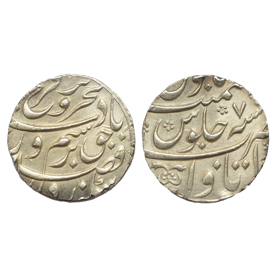 Mughals, Farrukhsiyar (AH 1124-1131 / 1713-1719 AD), Silver Rupee, 11.50Grms, Farkhanda Bunyad Hyderabad Mint, AH 1128, RY 5, mint name on top area and epithet on bottom area, floral design on both sides. (KM # 377.31). Very Fine+, Scarce.
