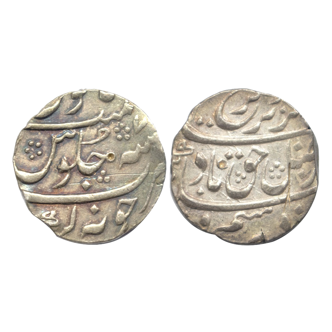 Mughals, Farrukhsiyar (AH 1124-1131 / 1713-1719 AD), Silver Rupee, 11.50Grms, Farkhanda Bunyad Hyderabad Mint, AH 1128, RY 5, mint name on top area and epithet on bottom area, floral design on both sides. (KM # 377.31). Very Fine+, Scarce.
