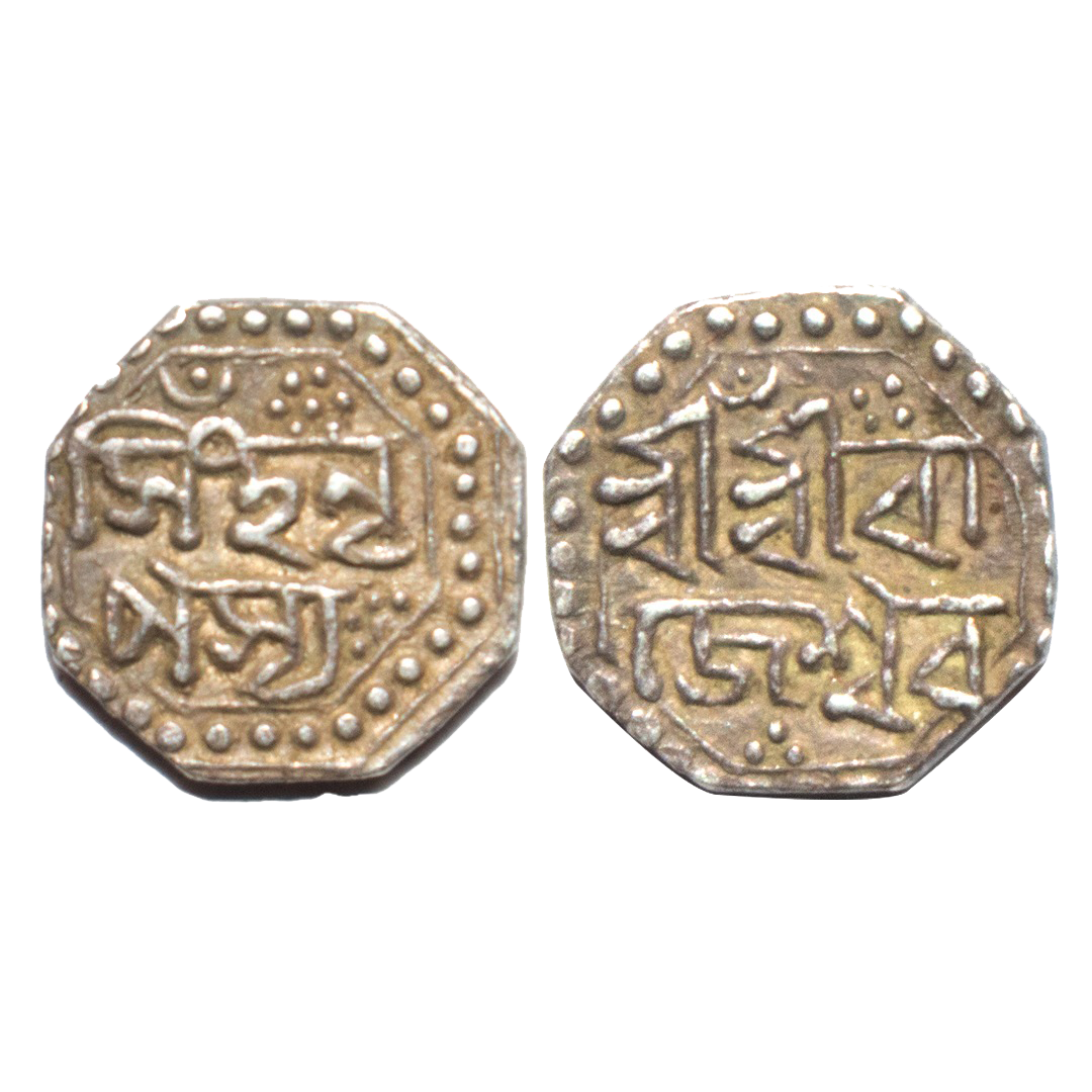 Rajeswara Simha, Silver 1/4 Rupee, 2.82g, Assamese script, Saka 1679, obv. Sri Sri Ra/jesvara Sim/ha Nrpasya, rev. in two lines Sake 1690, with crescent above (KM #132). Very Fine+, Rare.