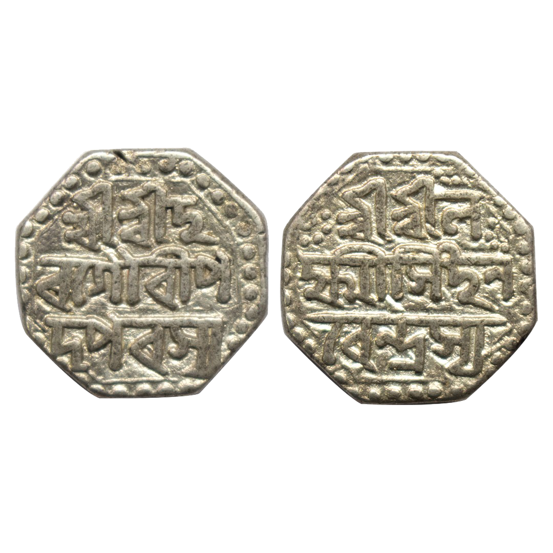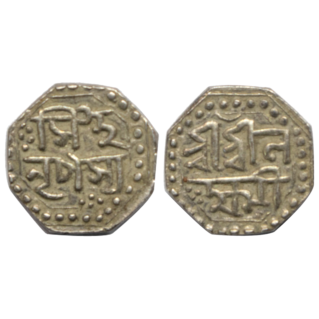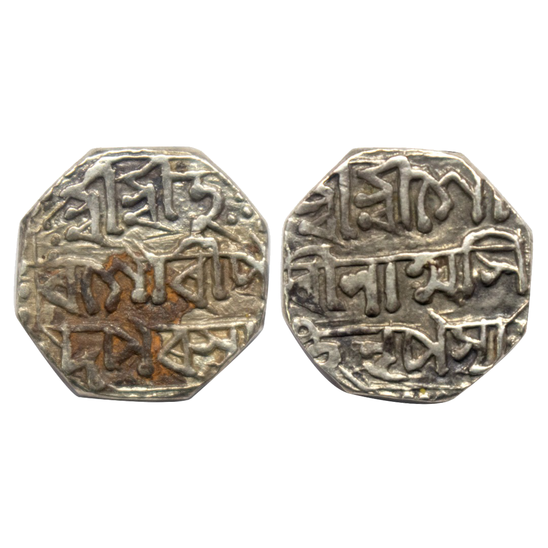 Rajeswara Simha, Silver Rupee, 11.24g, Saka 1685, Persian script, Rangpur Mint, obv. Ain sikkah zad chu zaq ze mihr mah, sri rajesvara singh sultan alam panah; (Sri Rajesvara Simha, refuge of the world, struck this coin truly like the sun and the moon), rev. zarb rangpur sanah 1685 jalus maimanat manus, small winged lion running to right at bottom, various dotted flowers all over on both sides Km#156Very Fine+, Rare
