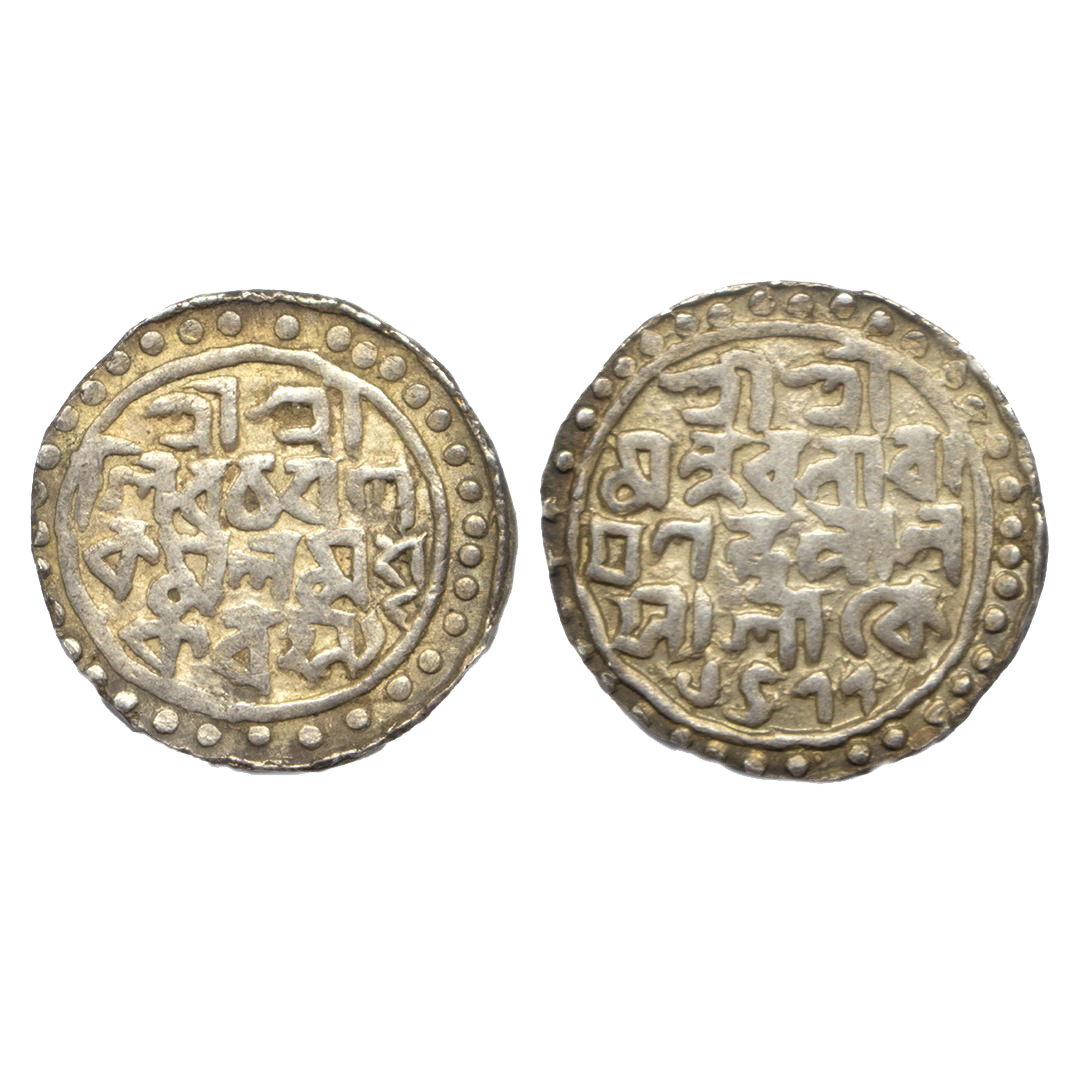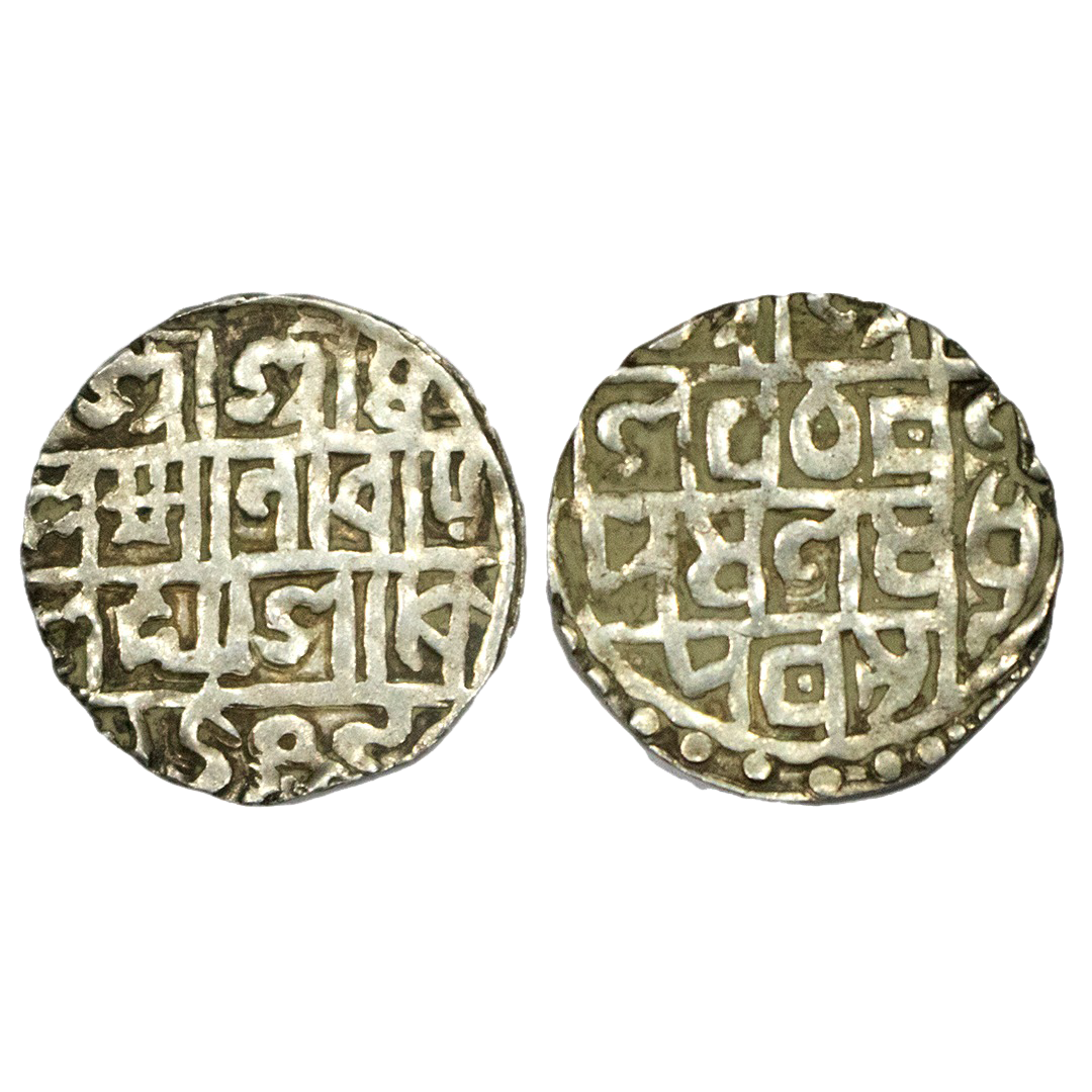 Independent Kingdoms, Assam, Brajnath Simha, Silver 1/8 Rupee, 1.38g, undated, Assamese script, obv. Sri Sri Bra/janatha, rev. Simha Nr/pasya (KM # 262).Very Fine+, Rare.