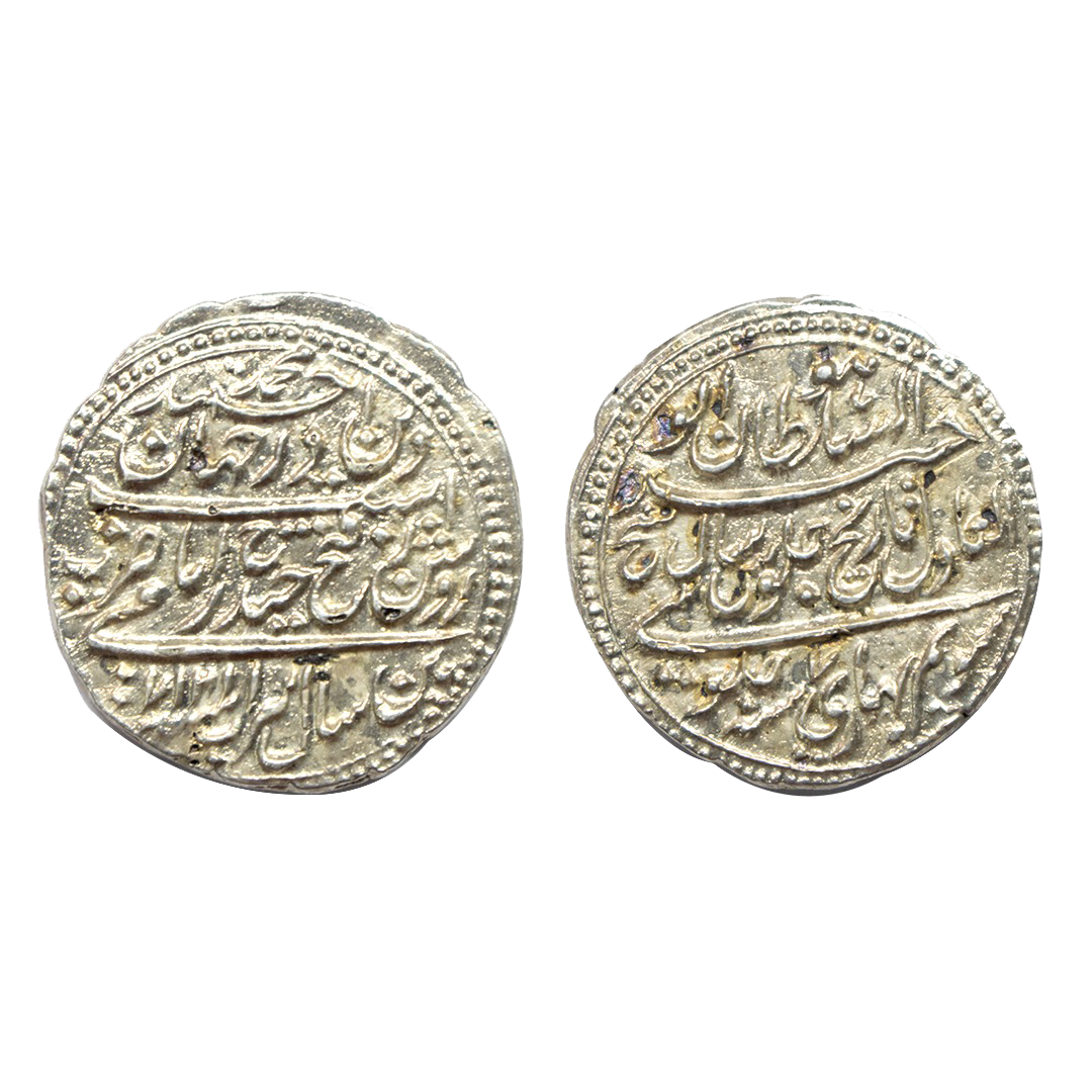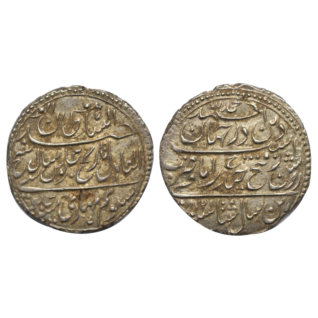 Maratha Confederacy, Saharanpur Dar-us-Surur Mint, Silver Rupee, AH 1207 /34 RY, Saya-e-fazle Elah Couplet, In the name of Shah Alam II, Obv: Persian legend Sikka zad bar haft Kishwar Saya-e-fazle Elah, Hami dine Muhammad Shah Alam Badshah with Hijri year 1207, Rev: Persian legend sana 34 julus & zarb Saharanpur with the epithet Dar-us-Surur completely visible at the top, (M&W # T1a), graded & slabbed by NGC as MS65, Rare in this grade.
