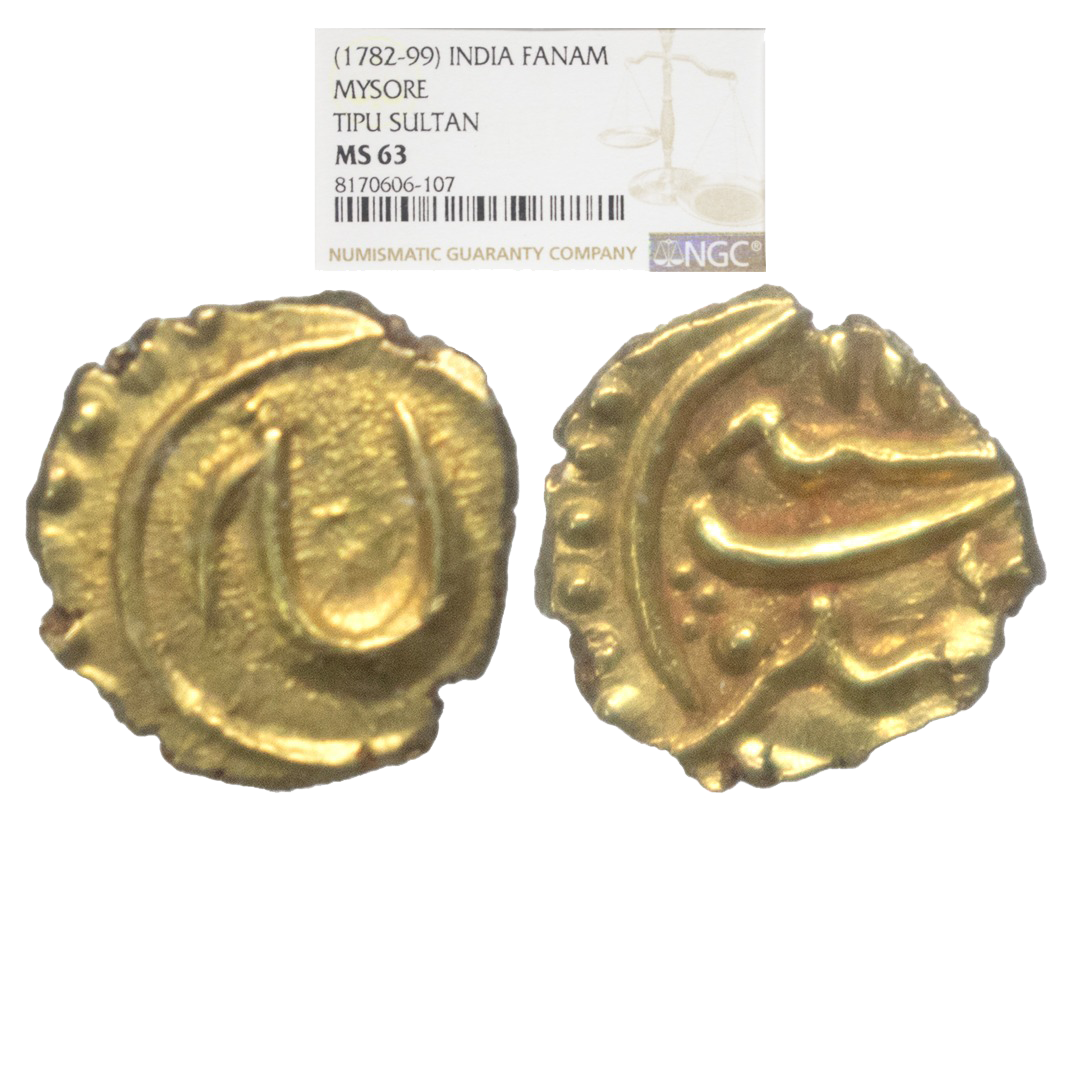 Mysore Kingdom, Tipu Sultan (AH 1197-1213 /1782-1799 AD), Kalikut Mint, Gold Fanam, AH 1200 (1785), Obv: Persian letter Ha in a dotted circle, Rev: Persian legend zarb Kalikut & sana 1200 Hijri year completely visible at the top, 0.38g, 7.55mm, (KM # 78), graded & slabbed by NGC as MS 63, Rare in this grade.