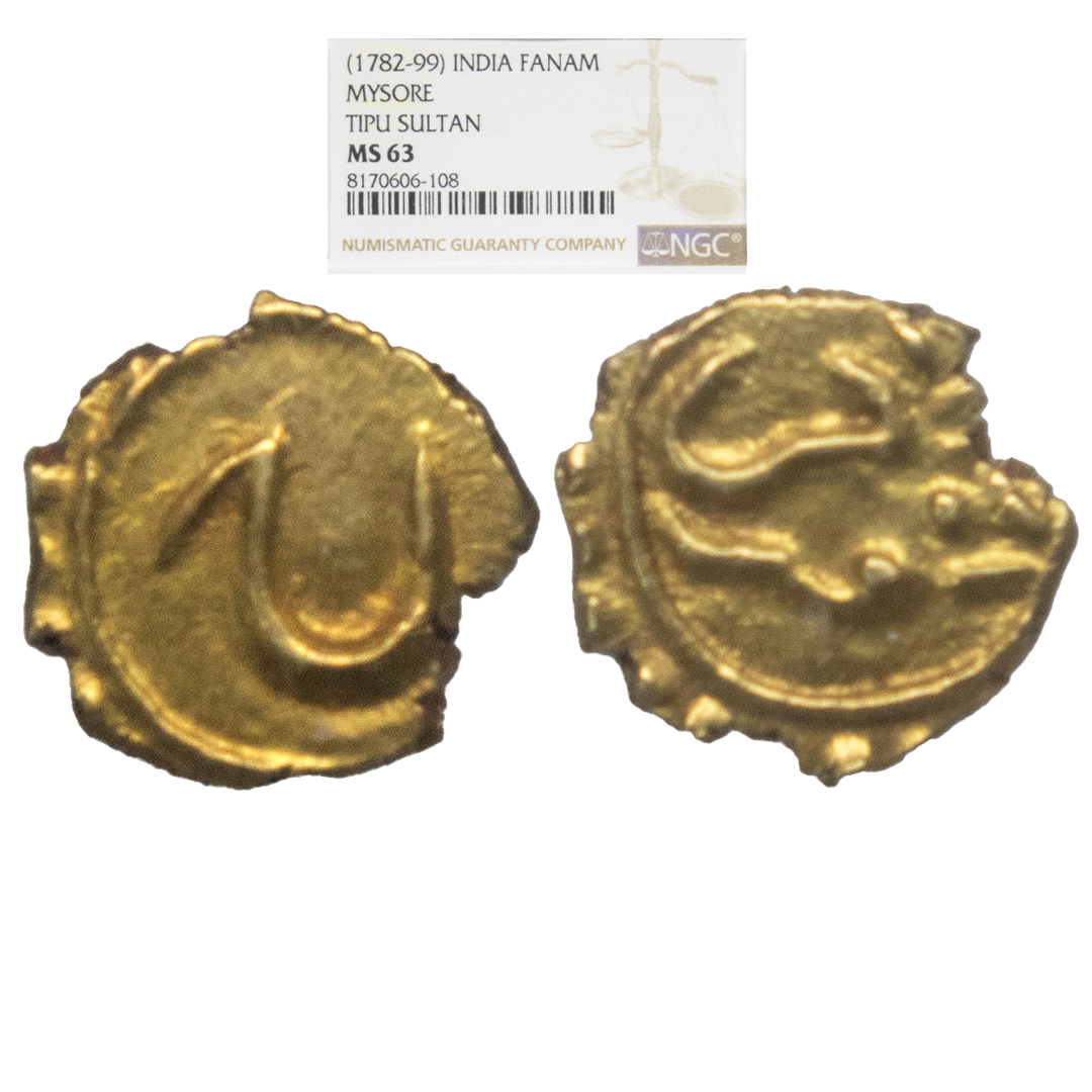 Mysore Kingdom, Tipu Sultan (AH 1197-1213 /1782-1799 AD), Farruqi Mint, Gold Fanam, Obv: Persian letter Ha in a dotted circle, Rev: Persian legend zarb Farruqi & sana Hijri year at the top, 0.38g, 7.55mm, (KM # 78), graded & slabbed by NGC as MS 63, Rare in this grade.