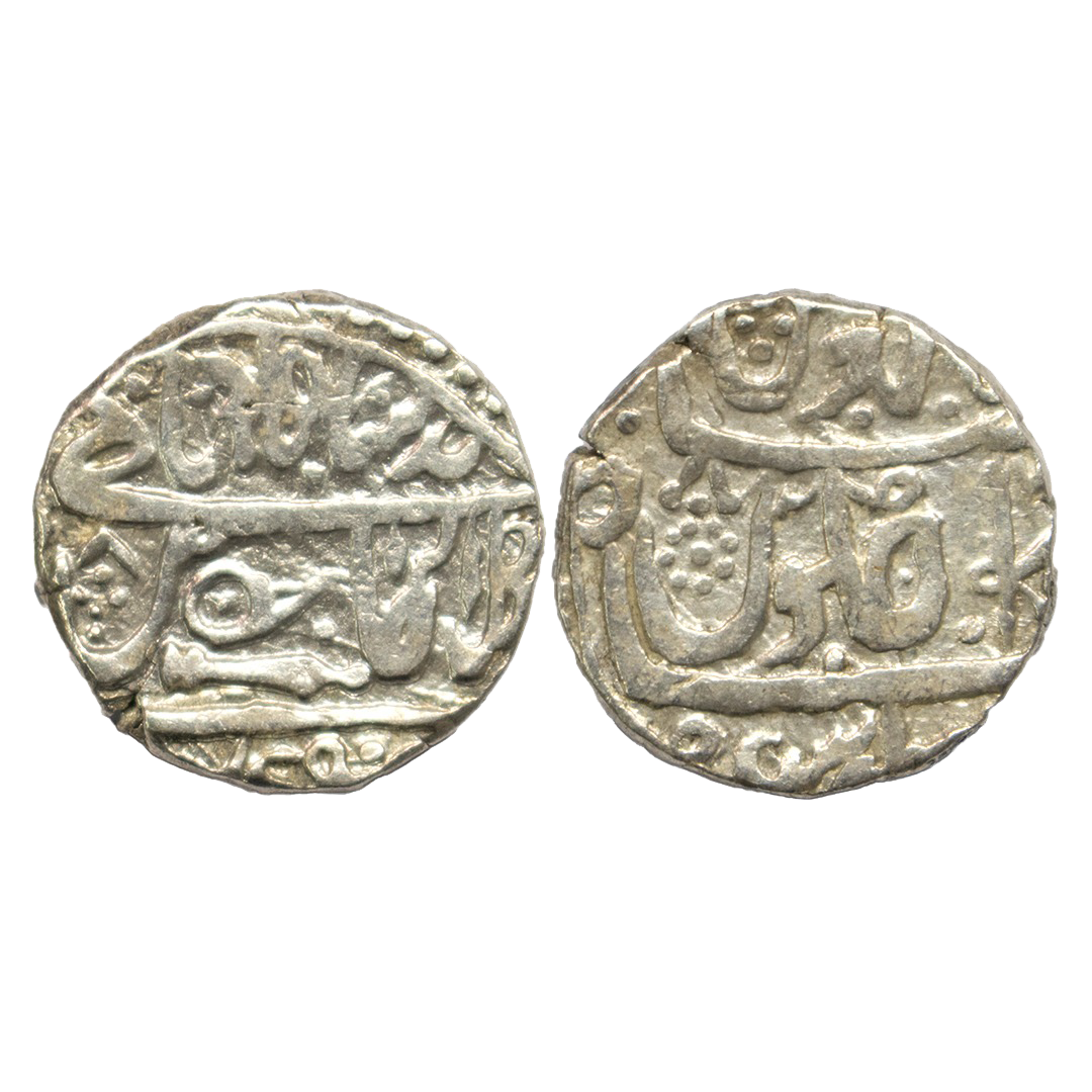 Gwalior State, Daulat Rao (AH 1209-1243, 1794-1827 AD), Jean Baptiste Filose Issue Silver Rupee, 10.65 gms, 20.01mm, Isagarh Mint, AH 12xx, Canon symbol on obverse & scmitar and battleaxe on reverse, Isagarh means Fort of Jesus, listed in ONS Journal #198, very fine, rare.