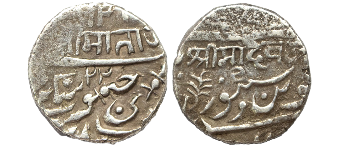 Princely States, Jhalawar, Silver Nazarana Rupee, 11.28Grms, Jhalawar Mint, in the name of Bahadur Shah II, AH 1256, RY 3, Jhar symbol on rev as a mint mark. (KM # C29).