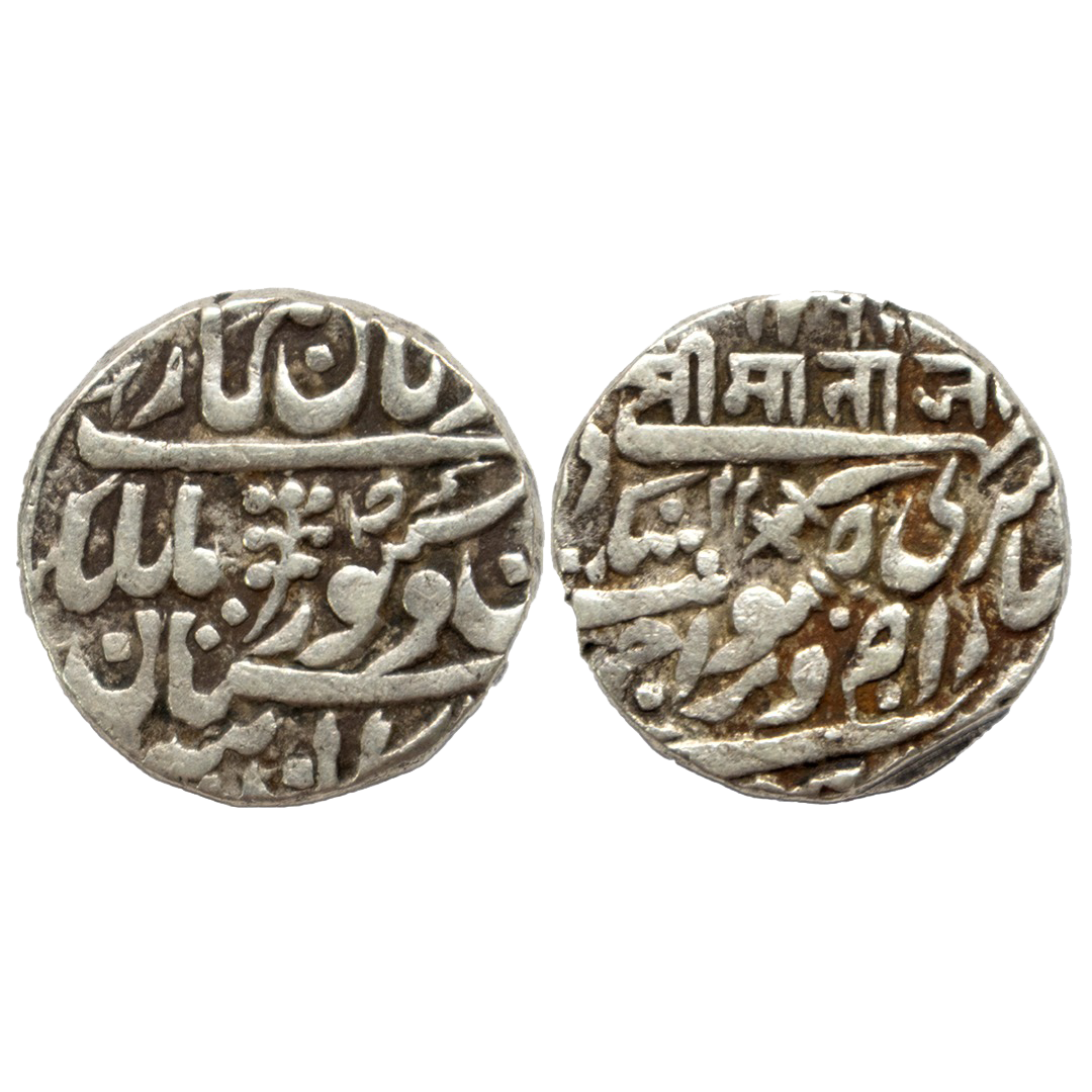 Princely States, Jhalawar, Silver Nazarana Rupee, 11.28Grms, Jhalawar Mint, in the name of Bahadur Shah II, AH 1256, RY 3, Jhar symbol on rev as a mint mark. (KM # C29).