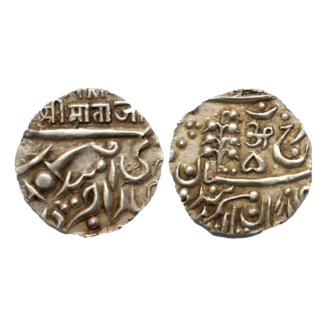 Princely States, Jhalawar, Silver Nazarana Rupee, 11.28Grms, Jhalawar Mint, in the name of Bahadur Shah II, AH 1256, RY 3, Jhar symbol on rev as a mint mark. (KM # C29).