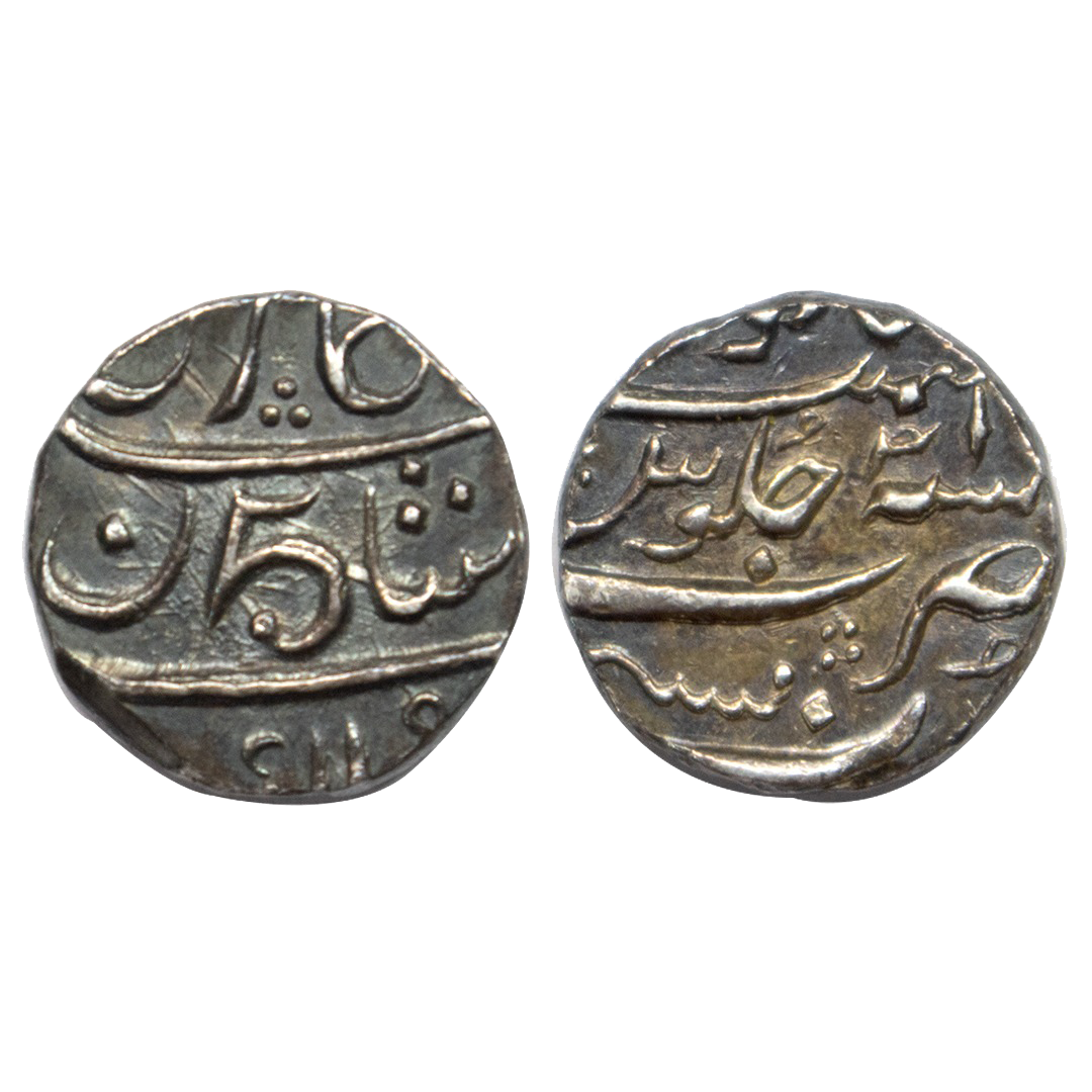Bengal Presidency, Shahjahanabad Mint, Silver Nazarana Rupee, 11.05Grms, in the name of Shah Alam II, AH 1220/48, obv. and rev. legends within wreath of roses, thistles and shamrocks, with the royal umbrella and jasmine flower in the center, Sahib Qiran legend of the Mughals type. Issued immediately after Lord Lake s capture of Delhi. (Stevens # 8.32). About Extremely Fine.