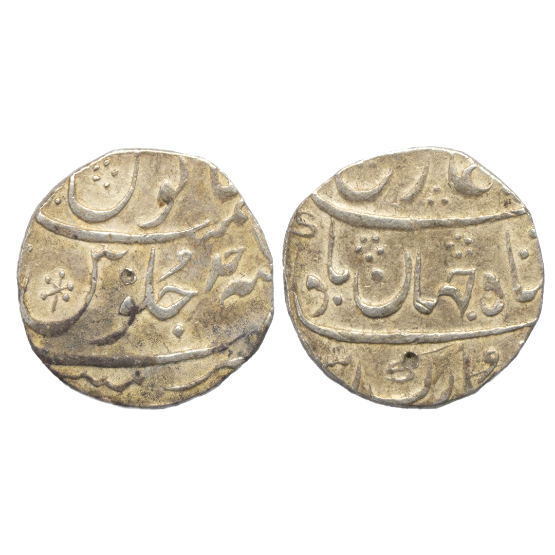 Bengal Presidency, Shahjahanabad Mint, Silver Nazarana Rupee, 11.05Grms, in the name of Shah Alam II, AH 1220/48, obv. and rev. legends within wreath of roses, thistles and shamrocks, with the royal umbrella and jasmine flower in the center, Sahib Qiran legend of the Mughals type. Issued immediately after Lord Lake s capture of Delhi. (Stevens # 8.32). About Extremely Fine.