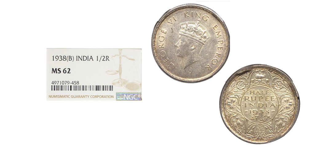1921, King George V, Silver Rupee, Bombay Mint, dot, minor lamination error, (PR # 227/GK # 1043), toning, superb quality, graded & slabbed by NGC as Mint Error MS 64, Very Rare in this grade.Rare date with lamination error in MS 64 Grade.