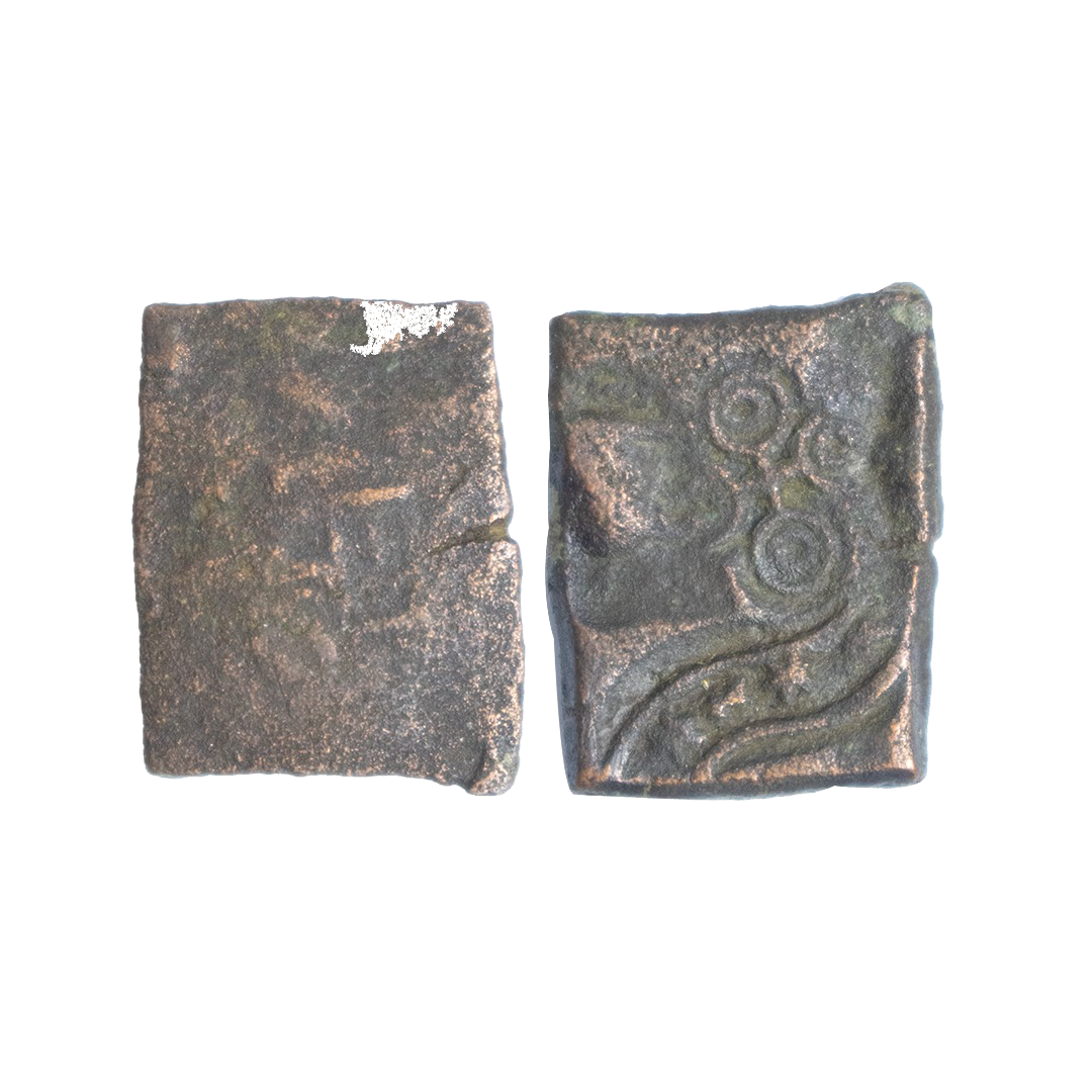 Post-Mauryan, Vidisha Region, Uninscribed type,Punch Marked, Copper Unit, 3.13Grms, Obv: A lotus flower, six armed, indradhvaja in railing, tree-in-railing and river with fishes symbol, Uniface. (Pieper # 493).