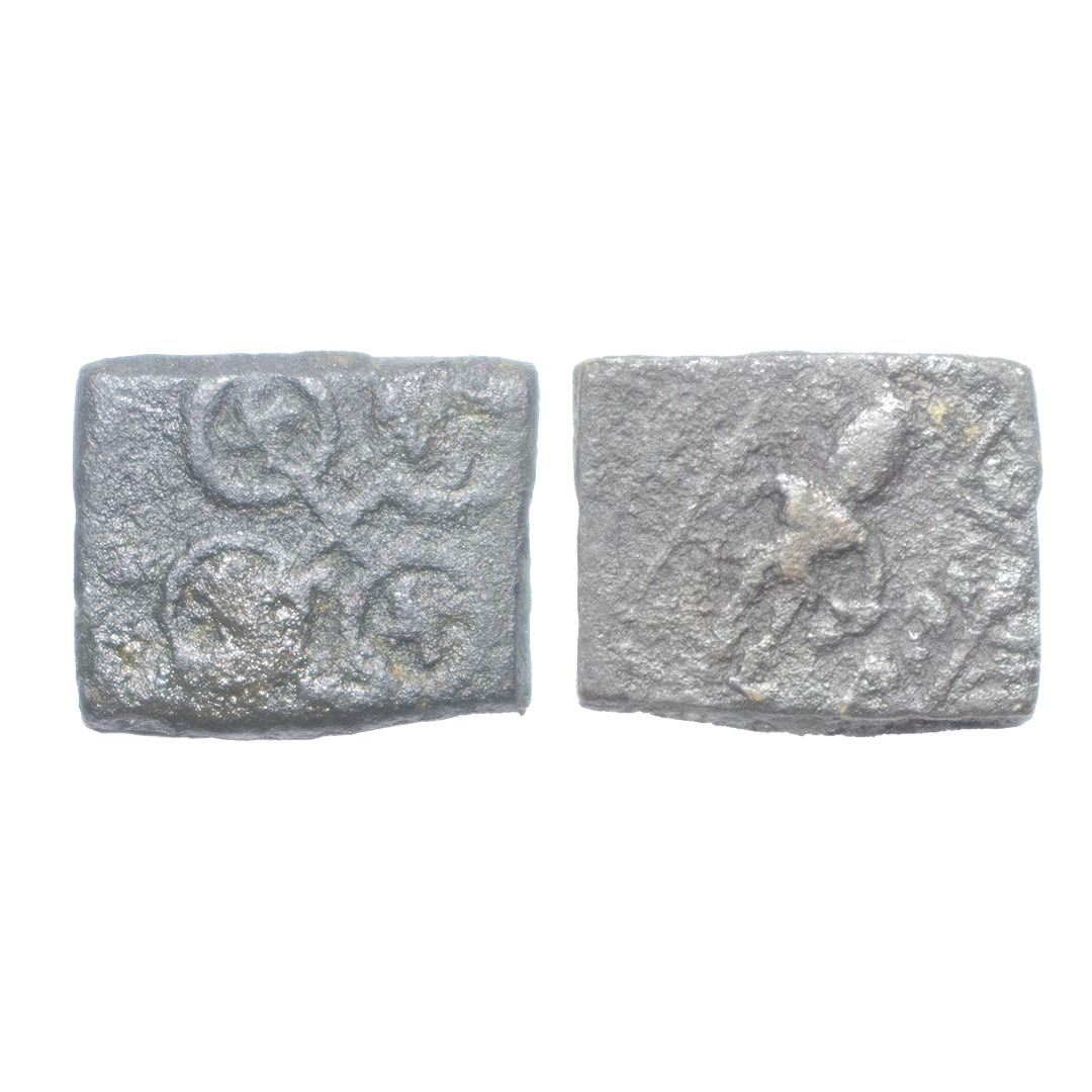 Post-Mauryan, Taxila region, Uninscribed type, Copper Unit, 6.32Grms, OBV: Elephant front facing, on left side hollow cross and above three arched hill (partly visible), REV: Lion to left side (worn out) above three arched hill with crescent. (Bopearachchi & Rahman # 133).