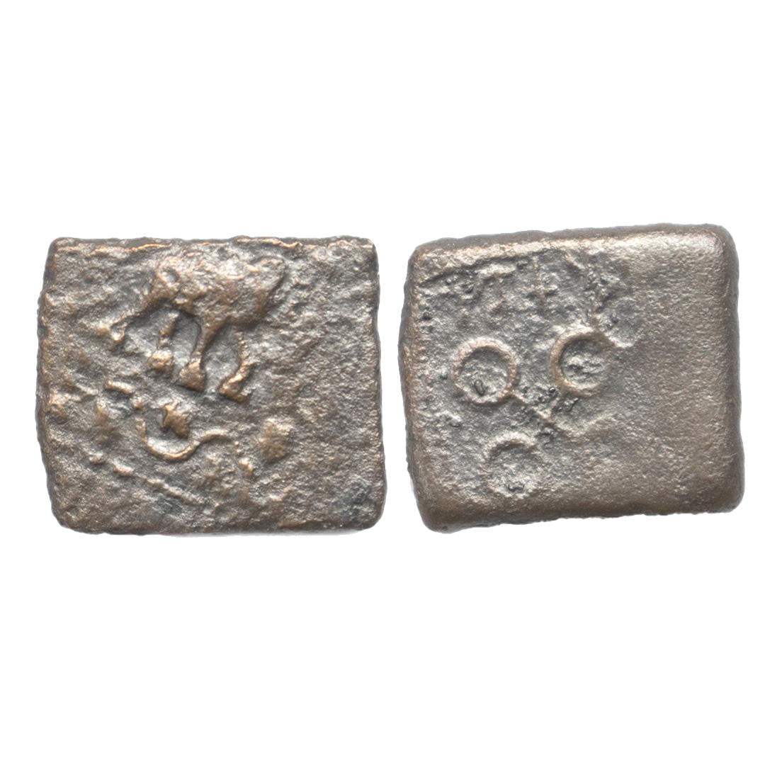 Post-Muryan, Ujjiaini region, Uninscribed type, 4.06Grms, OBV: Mahakal standing holding stick and kamandalu in hand repectively, tree-in-railing on right side, left side six arched hill and other symbol, REV: Four orbed ujjiaini symbol.