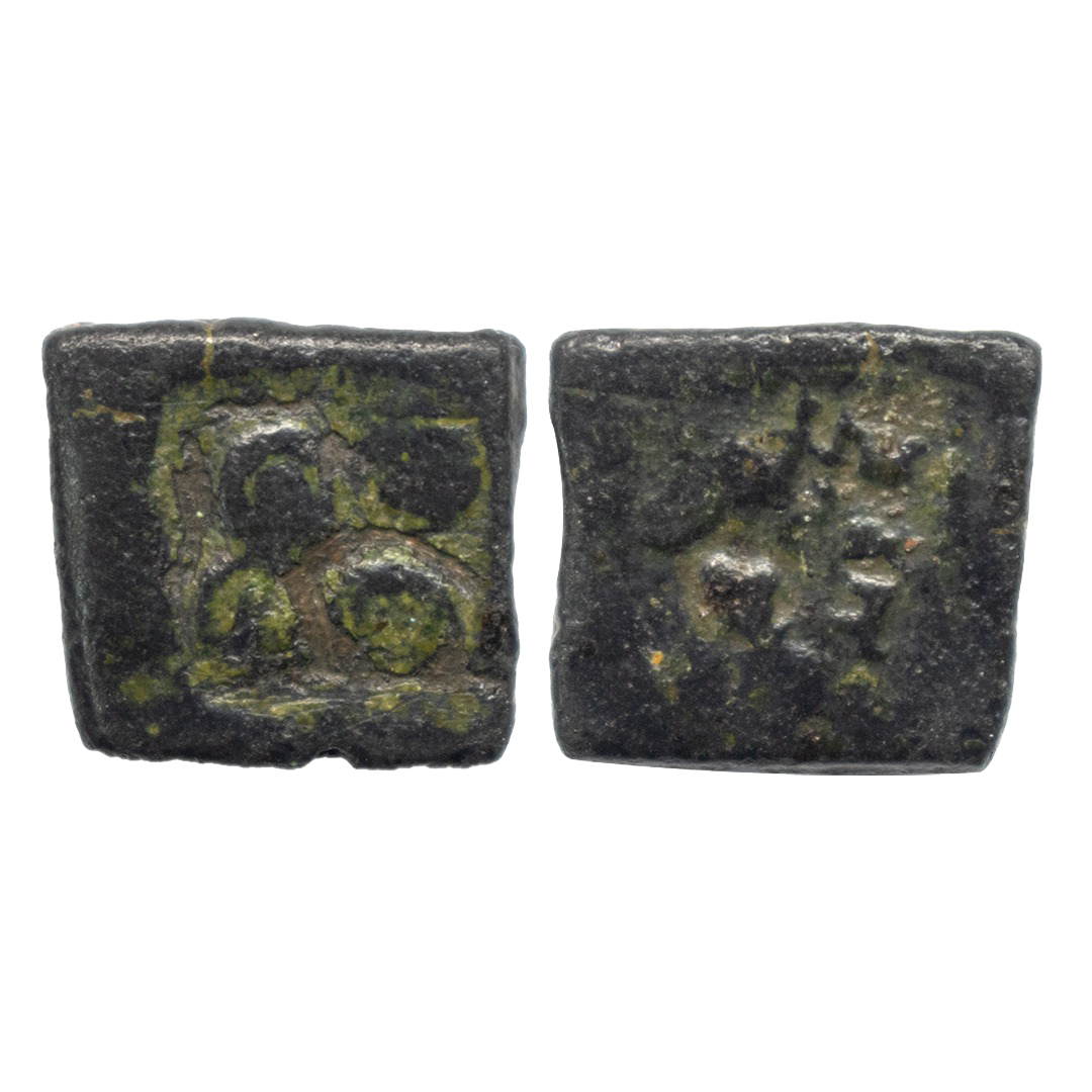 Pre-Satavahana, Bhimagari (c. 200 BC), Vidarbha Region, Copper Unit, 4.33Grms, OBV: Bull and lion in opposite direction and Brahmi legend in vertical 'Bhimaga[ri]', REV: Four orbed ujjaini symbol as a single punch. (Pieper # 2522). Very Fine.