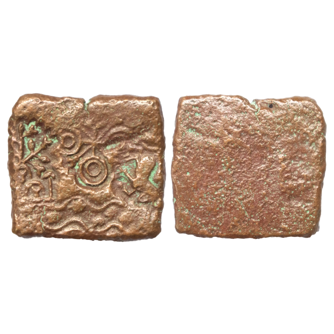Post-Mauryan, Vidisha region, Punch Marked, Narmada valley, Copper Unit, OBV: Double orb ujjaini, tree-in-railing, river with fishes and horse symbol, Uniface. (Pieper # 882). Very Fine.