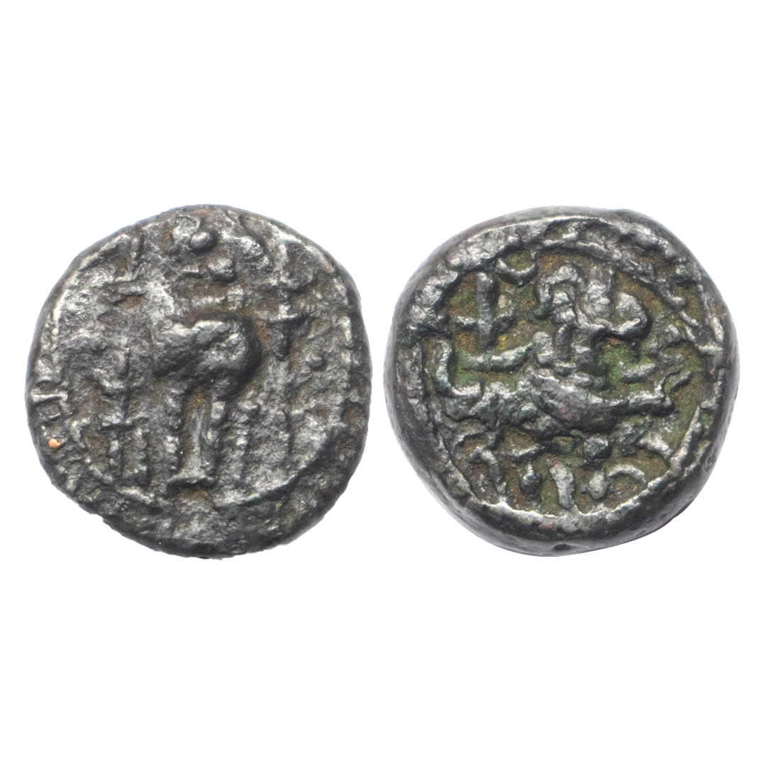 Vishnukundin Dynasty (c. 450-600 AD), Andhra Region, Copper Base Alloy, 6.61Grms, OBV: Roaring lion walking to right paw upraised, srivatsa and crescent symbol on its back, REV: Conch shell flanked by two tridents. (Pieper # 2985). Fine+.