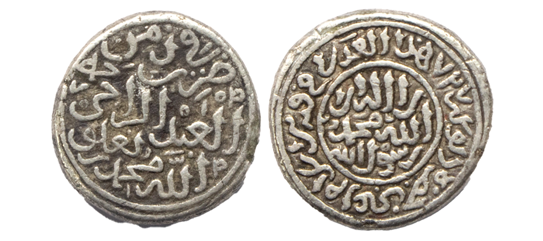 Delhi Sultan, Qutb al-Din Mubarak Shah (AH 716-720, 1316-1320 AD), Billon 8 Gani, 3.52 gms, Obv: qutb al-dunya wa'l din in center, abu'l muzaffar khalifat allah around, Rev: Mubarak Shah al-sultan ibn al-sultan, G&G # D271, very fine, very scarce in this flan size.